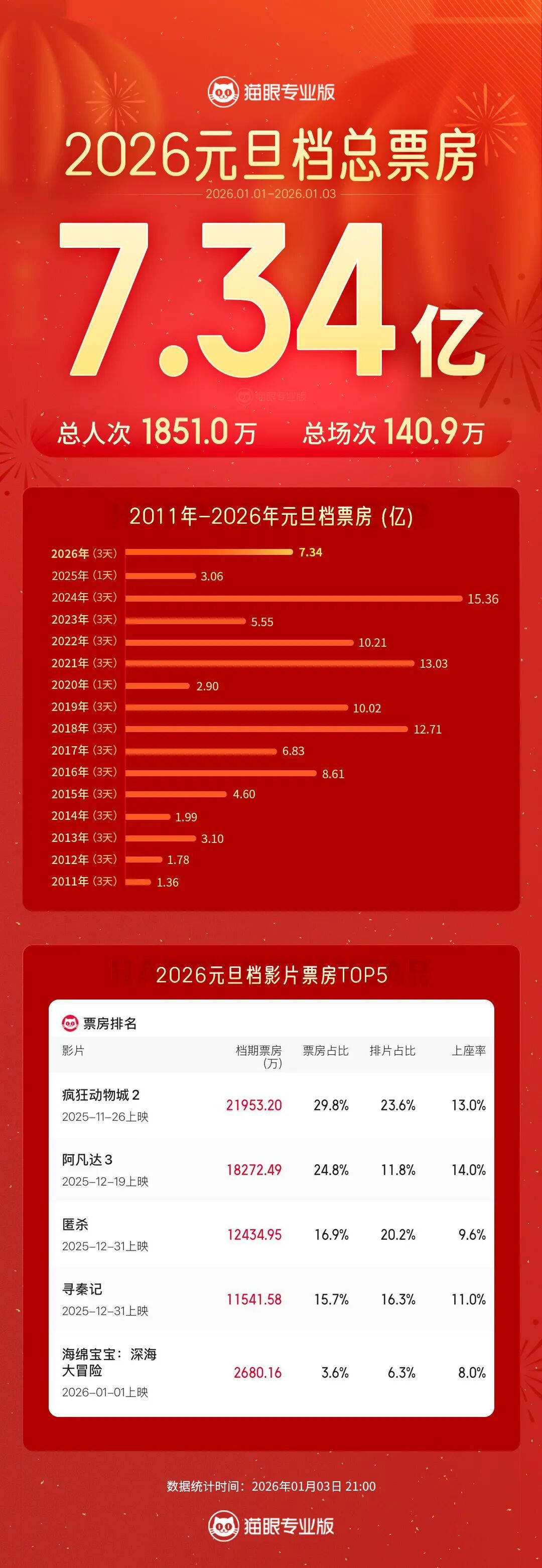 据猫眼专业版数据,截至1月3日21时,2026年元旦档(1月1日——1月3日)总票房7.34亿元,《疯狂动物城2》成2026年元旦档票房冠军。其中,广东省元旦档票房为1.13亿元,观影人次达282万,放映场次超15.7万,稳坐全国“第一票仓”。而电影《寻秦记》拿下广东元旦档票房冠军。