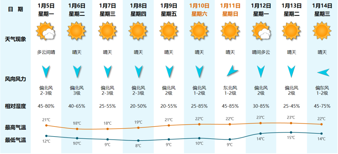 1月5日,多云间晴,12~21℃,相对湿度45%~80%;6日,晴天,10~18℃;7日,晴天,9~18℃。预计未来一周荔湾区天气干燥晴朗,周一夜间起至周四受弱冷空气补充影响,气温小幅下降;周五起冷空气影响减弱,气温逐渐回升。(荔湾区气象台1月4日17时发布)